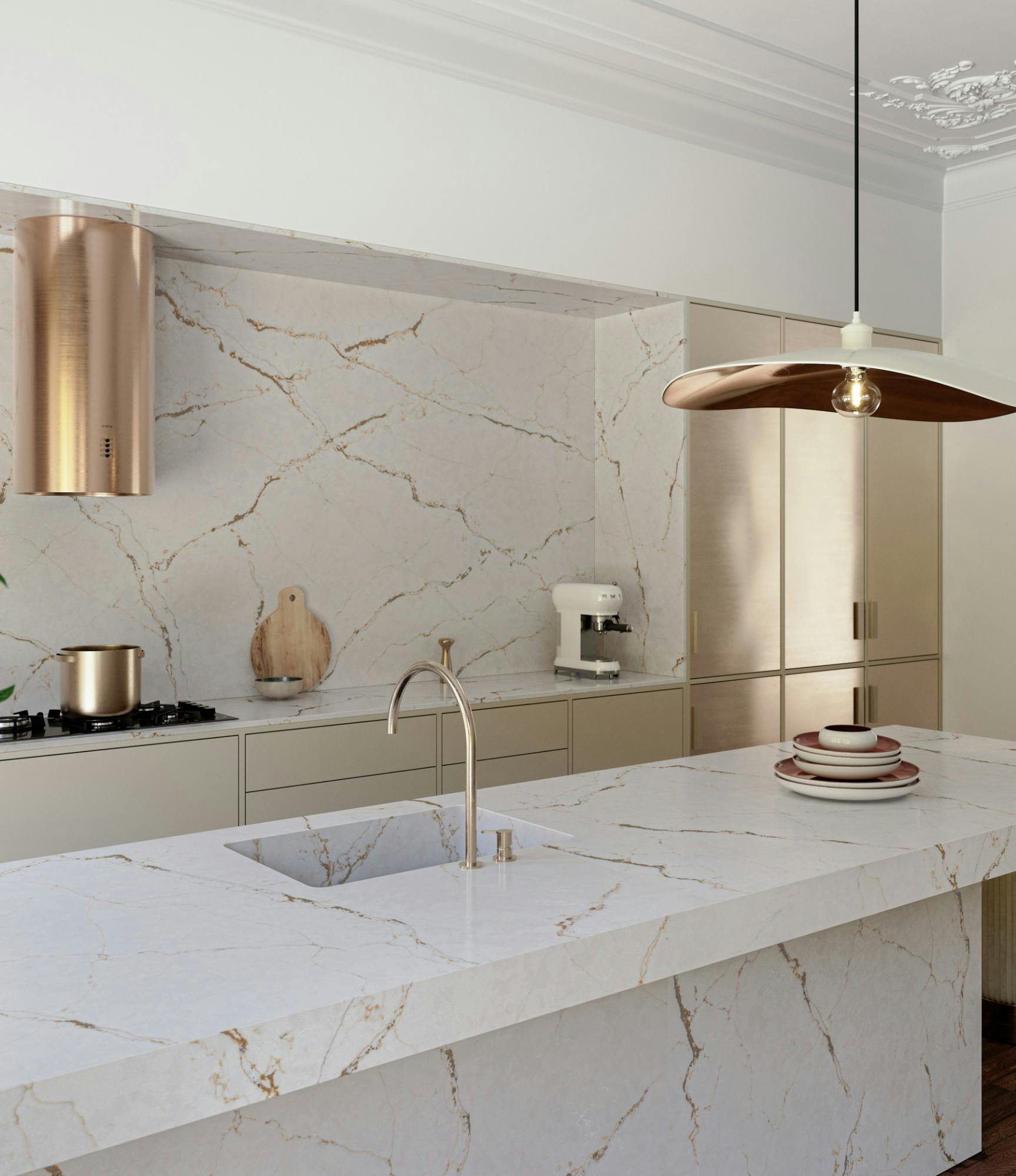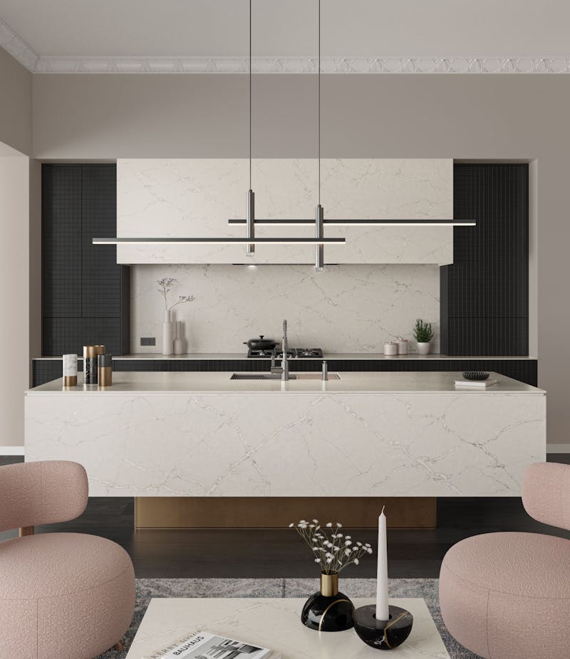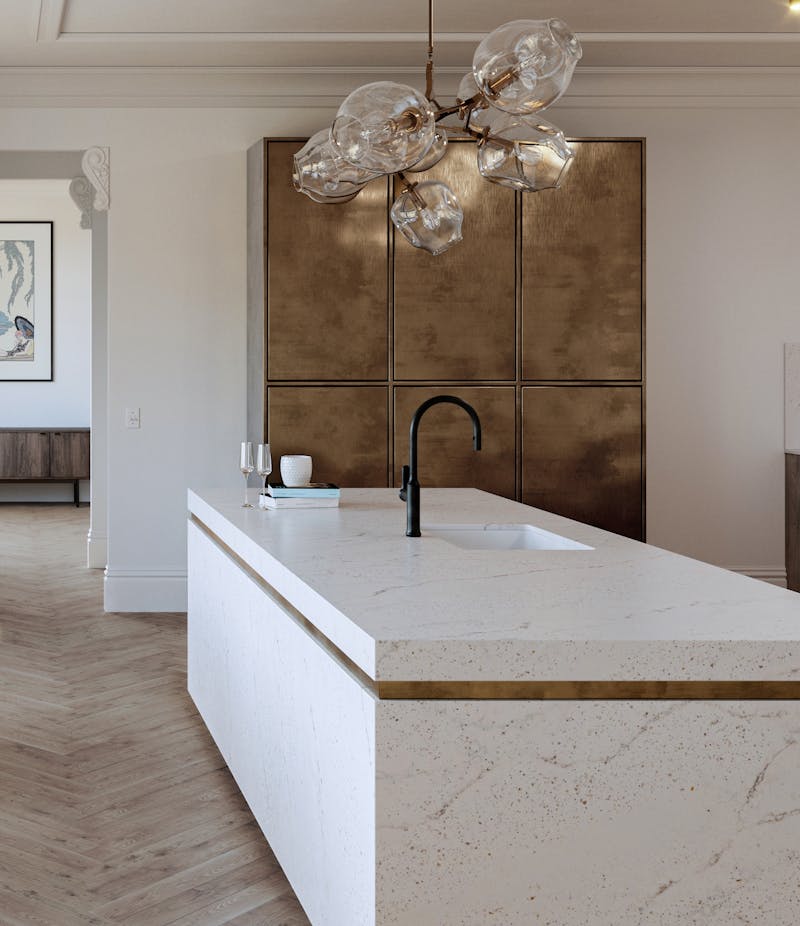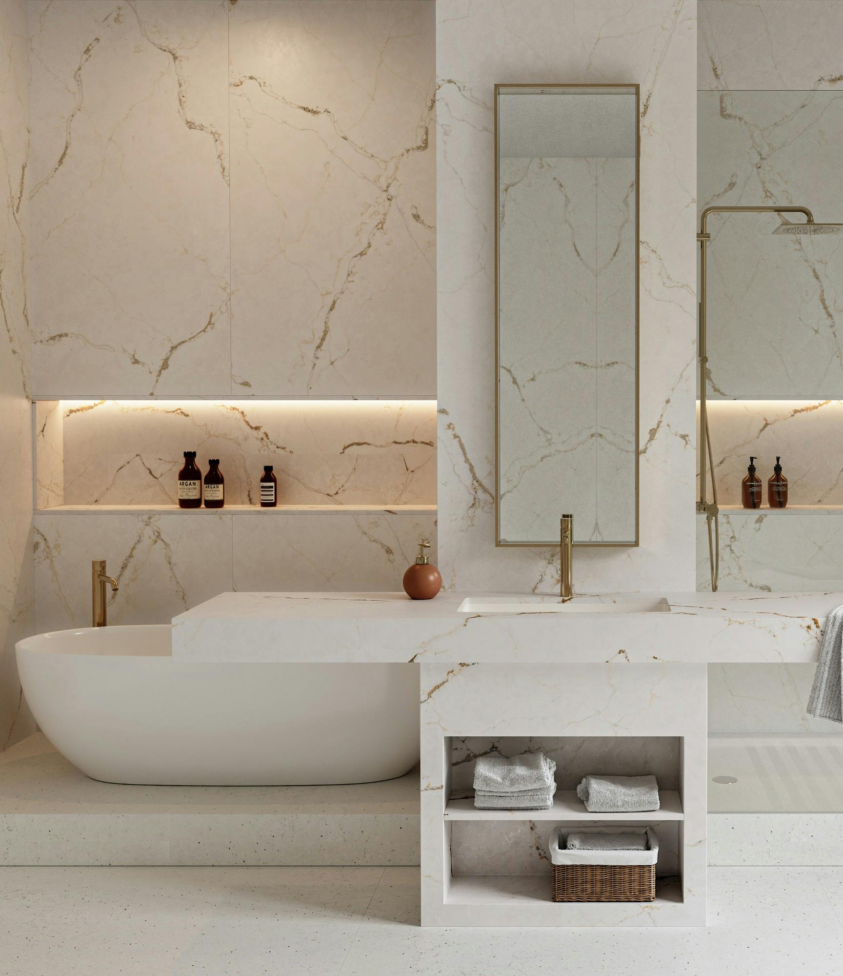 Un diseño que hipnotiza por sus delicadas vetas, su fluida textura y algunos acentos metálicos como diamantes, que aportan profundidad y se interponen sobre una base cremosa y suave.