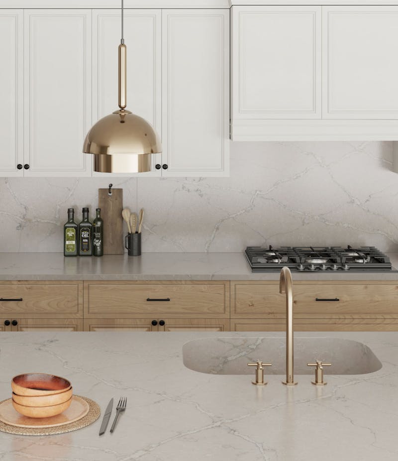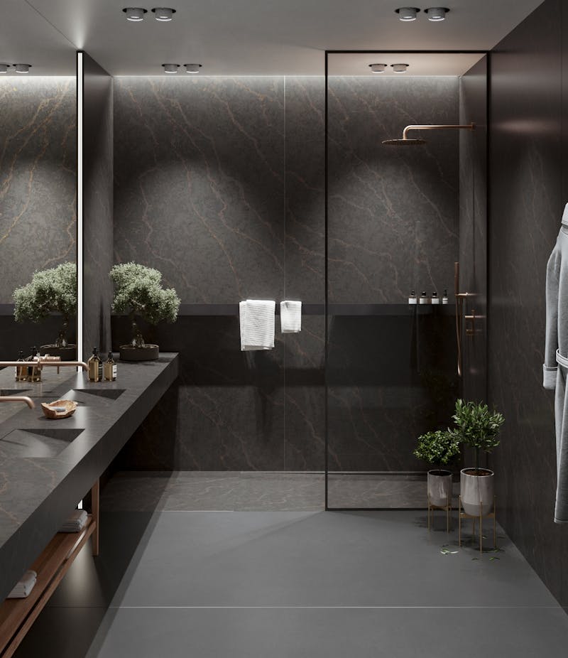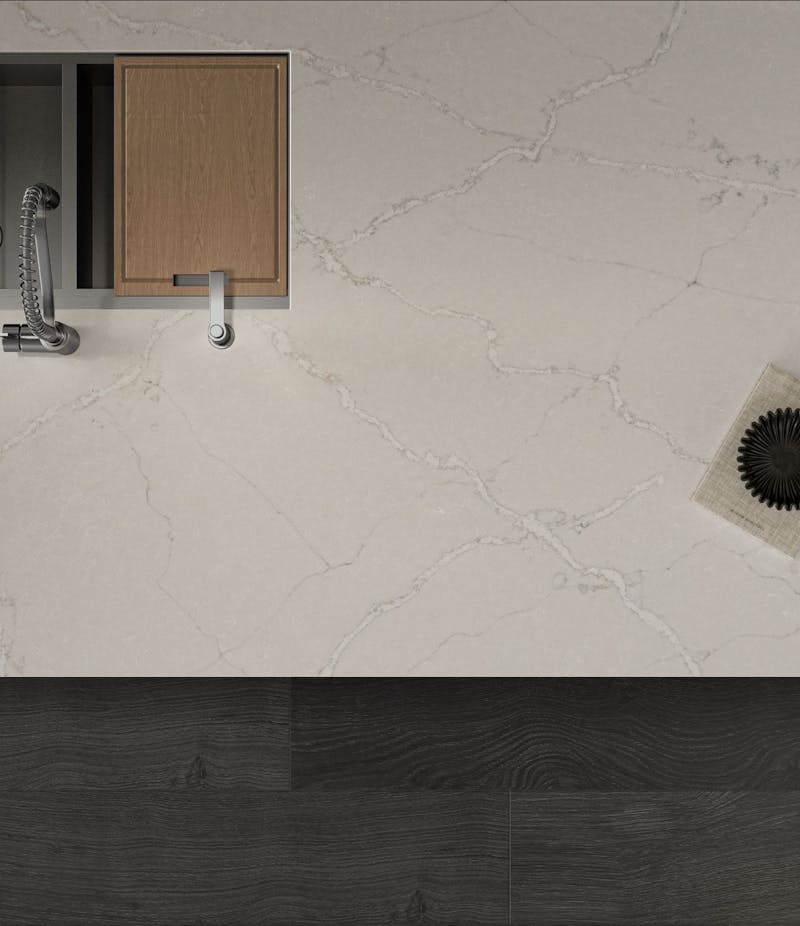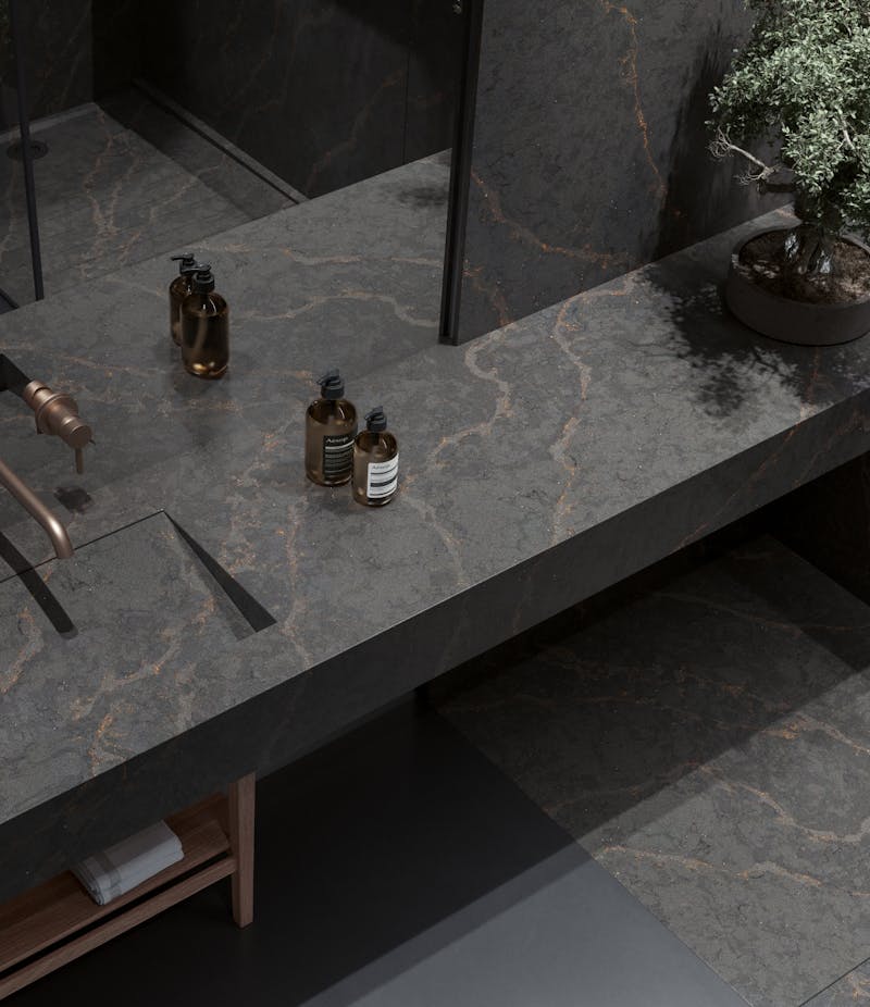 Es el color más neutro y versátil de la colección. Dos suaves tonos de marmoleados de base, con efectos degradados que generan profundidad. Vetas plateadas y grises oscuras se interponen para crear una superficie con carácter y personalidad.